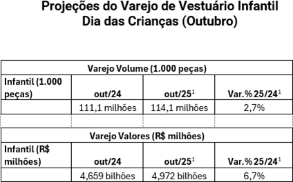 Mais do que uma data comemorativa, o Dia das Crianças se consolidou como motor de dinamização do varejo infantil, capaz de impulsionar lançamentos de coleções, estratégias promocionais e ampliar a fidelização de consumidores. Para 2025, as estimativas do IEMI – Inteligência de Mercado indicam que as vendas do setor em outubro devem alcançar R$ 4,97 bilhões, alta de 6,7% em relação ao ano anterior. Em volume, o crescimento projetado é de 2,7%, totalizando 114,1 milhões de peças de vestuário infantil.